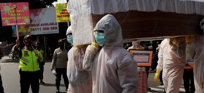 اسی سلسلے میں انڈونیشیا میں عوام کو کورونا سے ڈرانے کے لیے کورونا مریض کی نقلی لاش کے ساتھ پریڈ کی گئی، اسپتال عملے کے اہلکاروں نے تابوت کو کاندھو پر اٹھا رکھا تھا۔